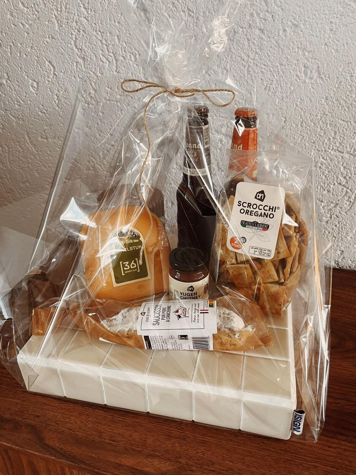 Verras iemand met een feestelijk kerstpakket: een handbetegeld plateau met heerlijke borrelhapjes. Perfect voor gezellige avonden vol smaak en sfeer. Ideaal als cadeau of kerstpakket voor de feestdagen!